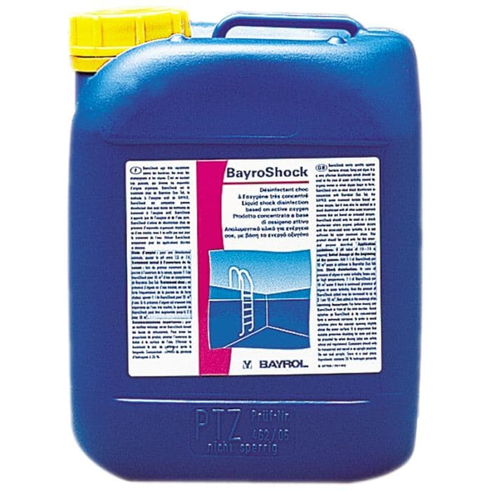 Bayrol BayroShock (Байрошок) - жидкий дезинфектор. Основан на активном кислороде. Быстро действует против бактерий, вирусов, микробов и водорослей. Рекомендуется использовать при замутнении воды в бассейне, вызванном органикой и ростом водорослей.